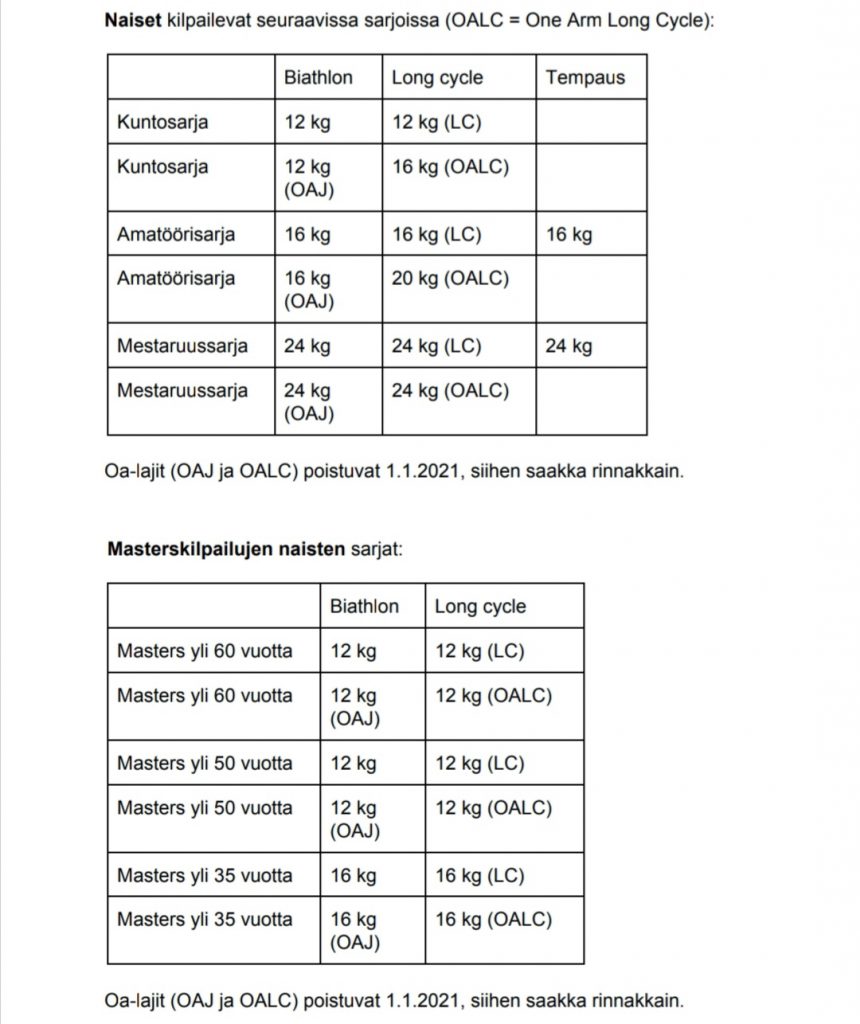 HUOM! OA-lajit eivät ole enää arvokisalajeja. Ne ovat poistuneet 1.1.2021, kuten säännöissä on merkitty ja alla olevien taulukoiden alareunaan on kirjattu.